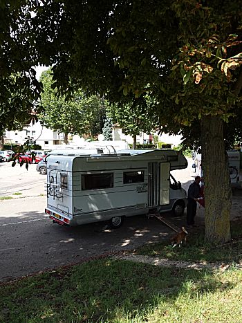 De camperplaats is een apart gedeelte bij een parking 48.7143452338, 10.77902374Foto's van de camperplaats en in de buurt