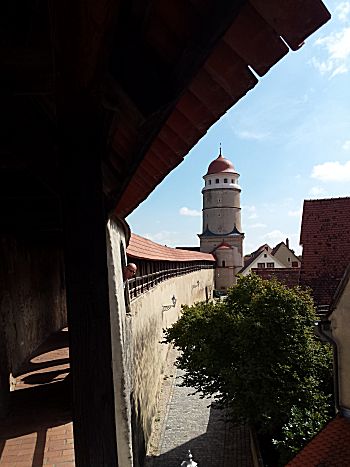 In Nördlingen hebben we geparkeerd op de camperplek en toen het stadje ingelopen. Een leuk stadje om te lopen met een aantal leuke bezienswaardigheden waaronder een stadsmuur met poorten en torens. We hebben er een mooi tijdje rondgelopen. De wandeling over de stadswal was ook leuk en hier kun je in tegenstelling tot Rothenburg ob der Tauber als lang persoon gewoon rechtop lopen. De muur uit 1327 is in zijn totaliteit bewaard gebleven. Een leuke route met uitzicht op het stadje van bovenaf.