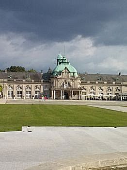 Het grote kuurpark met veel gebouwen en fonteinen
